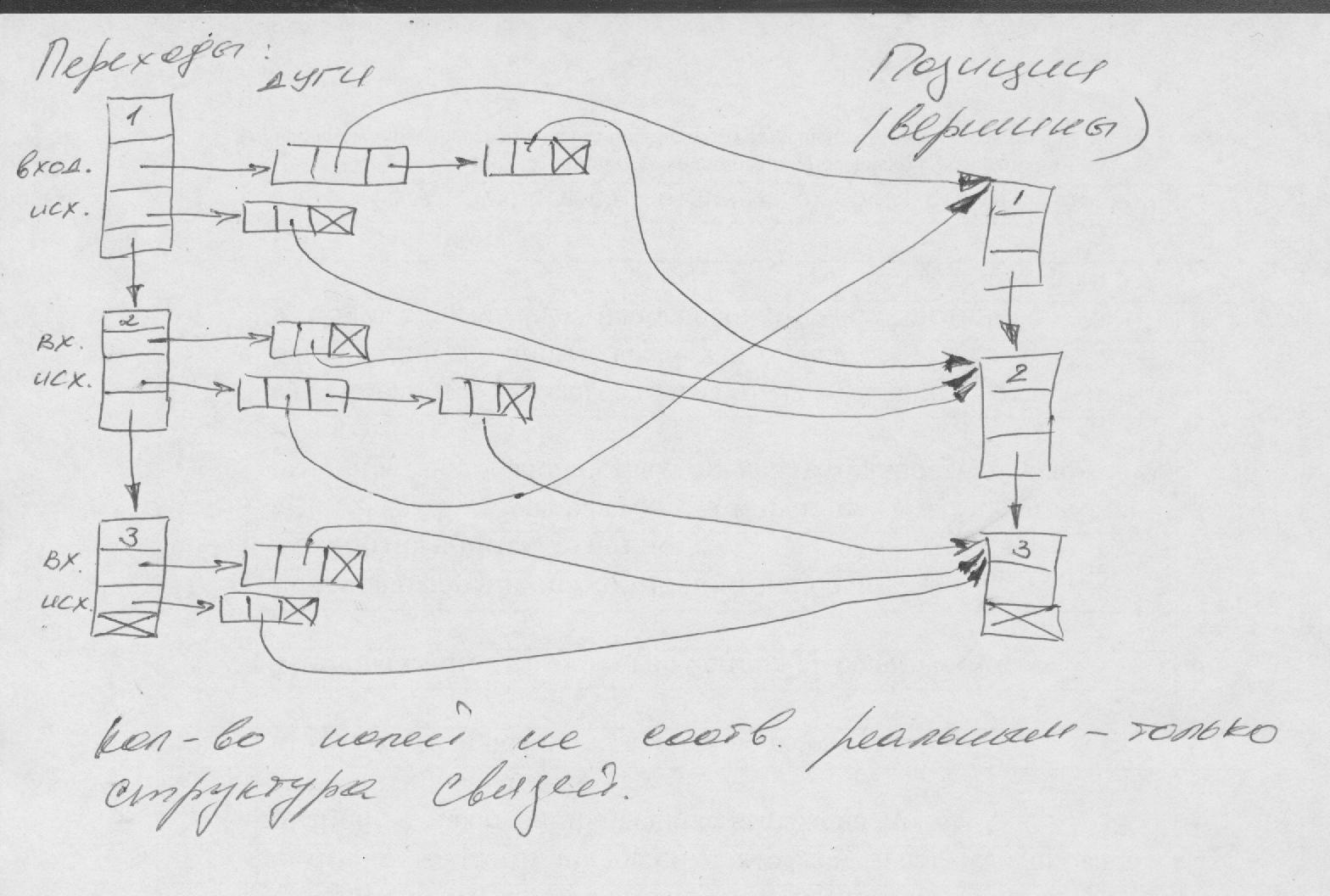 Чисто информационные поля не вырисовывала, только систему связей (что на что ссылается). То есть, например, в первый переход входит 2 дуги: из первой и второй позиции, а исходит всего одна - во вторую позицию. Во второй переход входит дуга из второй позиции, а исходит в первую и третью и т.д. Типы: Цитата Posref = ^Position; //Тип: указатель на позицию Lref = ^Leader; // Тип: указатель на заголовочный узел перехода Tref = ^Trailer; //Тип: указатель на дугу //Описание типа заголовочного узла перехода Leader=Record Key : Integer; // Имя заголовочного узла Trail1 : Tref; //Указатель на список входящих дуг Trail2 : Tref; //Указатель на список исходящих дуг Next : Lref // Указатель на следующий узел в списке заголовочных узлов end; //Описание типа дугового узла Trailer = Record Id : Posref; //Указатель на ту позицию, в/из которой входит/выходит дуга Count : Integer; //Количество дуг, связывающих эту позицию с переходом Next : Tref //Указатель на следующую дугу end; //Описание типа позиции Position = Record Key : Integer; Next : Posref; end; Эскизы прикрепленных изображений -------------------- Все содержимое данного сообщения (кроме цитат) является моим личным скромным мнением и на статус истины в высшей инстанции не претендует.