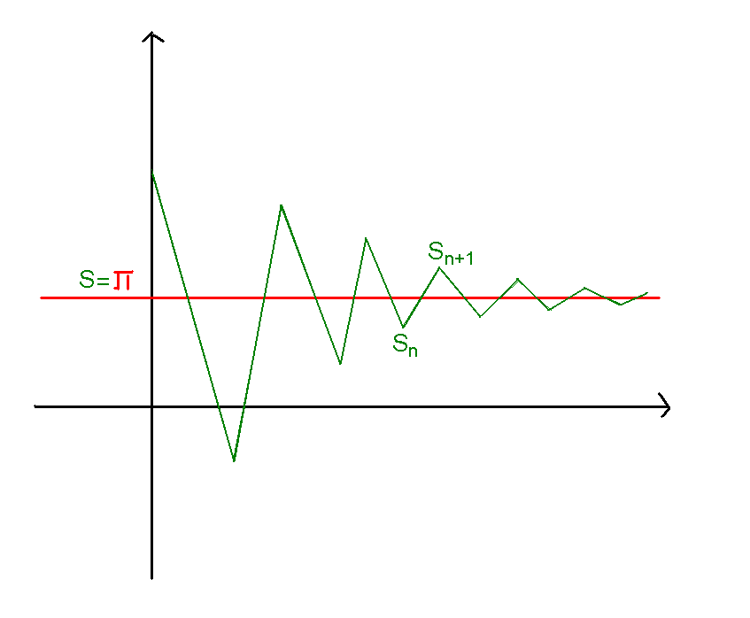 Вот это не очень ясно! Пример какой-то можешь привести. Какой пример?.. Я привел тебе точное математическое доказательство! Да еще и с рисунком!! Дай себе труд всмотреться в график - и ты все поймешь, там нет ничего сложного. Или уж открой любой учебник по матану, найди там тему знакопеременные ряды, прочти доказательство еще раз. А пример - ты, в конце концов его сам и делаешь. Так трудно закодировать несколько строк и убедиться? Код { Calculation the Pi, Liebniz formula } var i,n:integer; s,z:real; begin Write(' N = ');ReadLn(n); s:=0; z:=1; for i:=1 to n-1 do begin s:=s+z*1/(2*i-1); z:=-z end; WriteLn(' An = ',(1/n):10:8); WriteLn(' S(n-1) = ',s:10:8); WriteLn(' Pi/4 = ',(Pi/4):10:8); WriteLn(' 4*S(n-1) = ',(4*s):10:8); WriteLn(' Pi = ',Pi:10:8); ReadLn end. -------------------- я - ветер, я северный холодный ветер