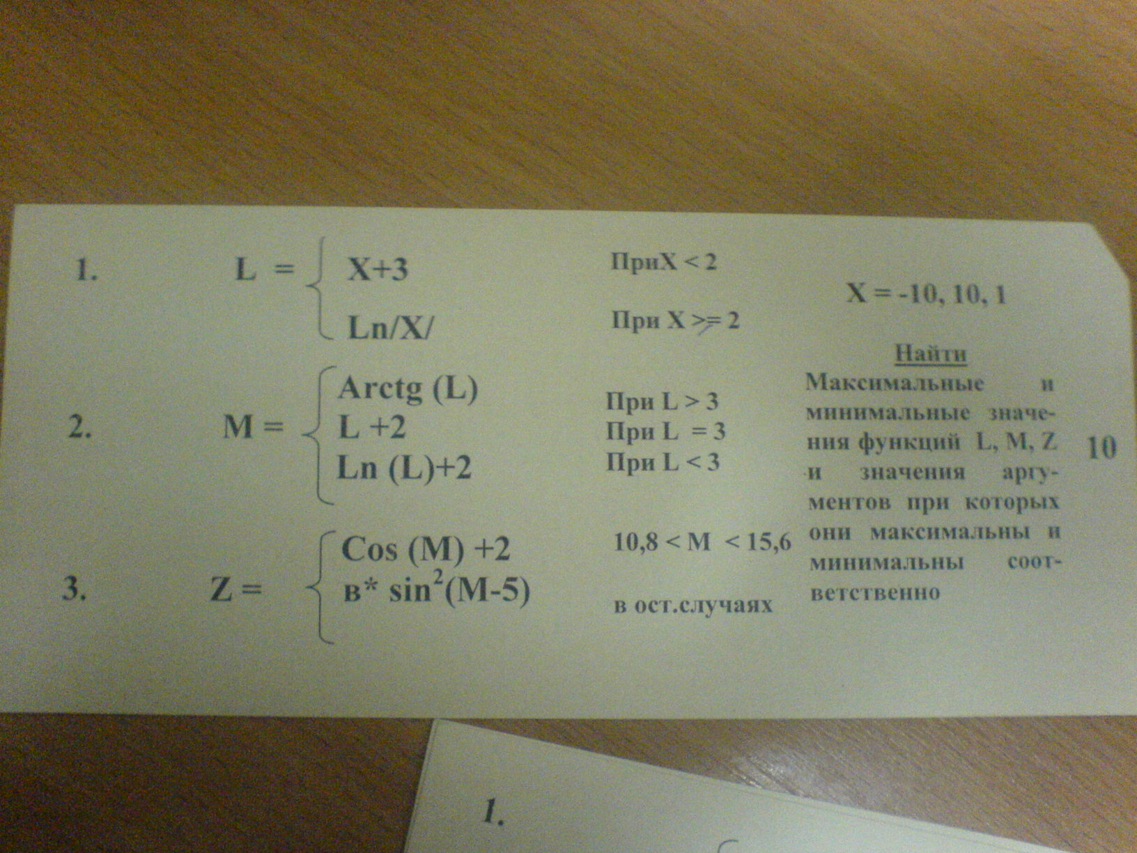 И, туплю с утра Макс. и мин. значения только при заданных х или вообще? Код INPUT "Vvedite x "; x IF x < 2 THEN LET l = x + 3 ELSE LET l = LOG(x) END IF SELECT CASE l CASE l > 3 LET m = ATN(l) CASE l = 3 LET m = l + 2 CASE l < 3 LET m = LOG(l) + 2 END SELECT IF (m > 10.8) AND (m < 15.6) THEN LET z = COS(m) + 2 ELSE LET z = b * SIN(m - 5) * SIN(m - 5) END IF PRINT l, m, z |
