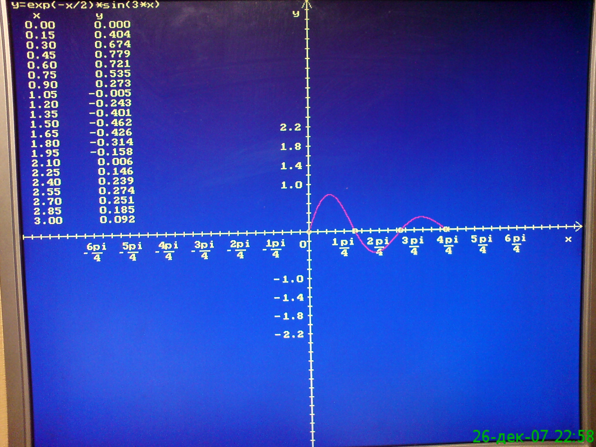 y:=exp(-x/2)*sin(3*x): h=0,15; 0<=x<=Пи