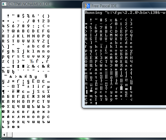 Цитата В двух компиляторах разные таблицы: Естественно... TPW выдает тебе таблицу для Windows-1251, а FPC - для Кодовой страницы 866 |