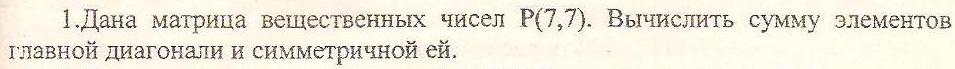 program qwesadf; uses crt; var p:array[1..10,1..10] of real;i,n,j:integer;s1,s2:real; begin clrscr; writeln('vvedite razmer matrici'); readln(n); writeln('vvedite elementi matrici'); s1:=0; s2:=0; for i:=1 to n do for j:=1 to n do begin readln(p[i,j]); s1:=s1+p[i,i]; s2:=s2+p[i,n+1-i]; end; writeln('summa elementov glavnoi diagonali ',s1:2:2); writeln('summa elementov diagonali simetrichnoi glavnoi ',s2:2:2); end.