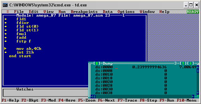 Цитата но как эт исправить ? В каком смысле "исправить"? Посмотреть на содержимое переменной F? Не проблема: запустил программу, дошел до строки FST f, выполнил ее, выбрал в меню Дебаггера View->Dump, в его контекстном меню - сначала Display As -> Float, потом GoTo -> название переменной, то есть F... Результат - на скриншоте:... Все нормально, значение правильное, что еще надо? |