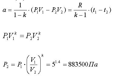 Смесь светильного газа и воздуха (k=1.38) с давлением p1= 90кПа и температурой t1=50 гр. Цельсия, адиабатно сжимается до объема в 5 раз меньшего чем начальный.