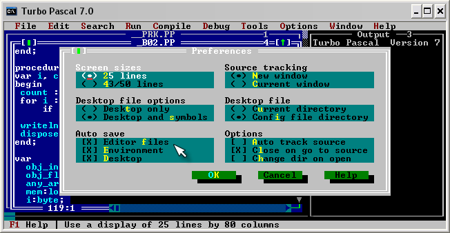 Цитата Попробовал, сработало ровно на один код, после путь к директориям опять сменился на старый. В меню Options -> Environment -> Preferences установи все "X"-ы в той группе, где у меня стоит курсор мыши... Тогда внесенные тобой изменения будут сохраняться... Эскизы прикрепленных изображений |