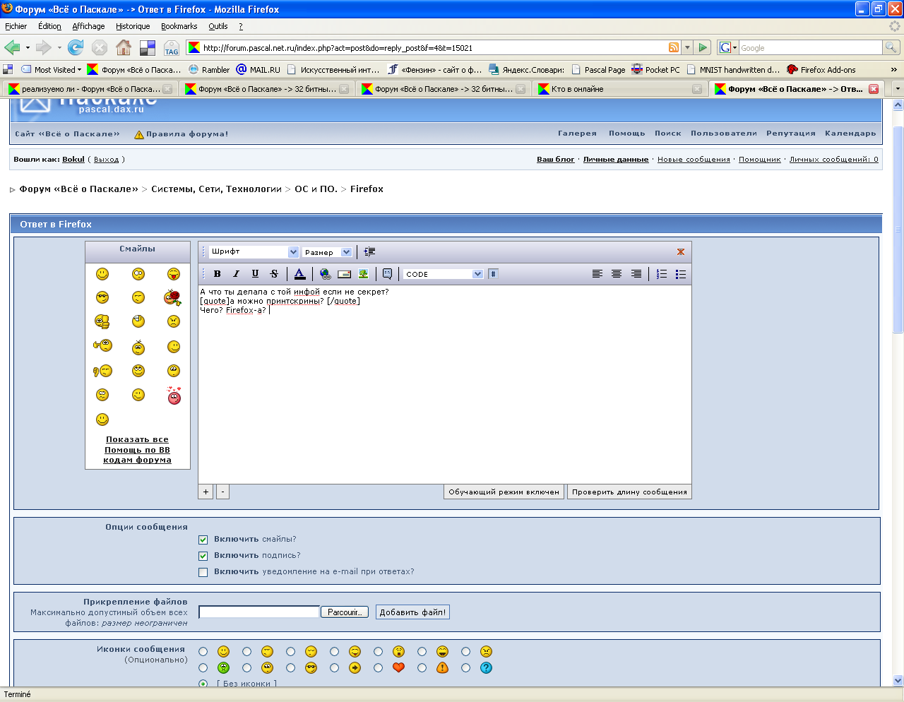 Цитата а можно принтскрины? Чего? Firefox-a? Цитата и еще вопрос: расширения никакие не ставили? может, в них дело? Есть. Может и в них. -------------------- Лао-Цзы :