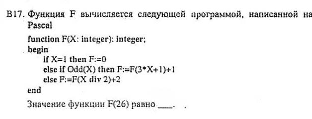 Код uses crt; function F(X:integer):integer; begin Writeln('X====',x); If X=1 then begin writeln('x=1 ->> f:=0 '); f:=0 end else if odd(x) then begin writeln('Ґ зҐв®Ґ -->> f:=f(3*x+1)+1'); f:=f(3*x+1)+1 end else begin writeln('зҐв®Ґ f:=f(x div 2)+2'); f:=F(X div 2)+2 end; end; begin clrscr; writeln(F(26)); end. тогда узнаете почему 18! 18 потому что в результате выполнения получаем 0 а потом складываем! А если вы занимались когда нибудь ПРОЛОГОМ, то вот дерево вывода(присоед.) ------------- Вам повезло, что я первый увидел вашу тему, AlaRic закрыл бы сразу, и правильно сделал бы, ПРАВИЛА РАЗДЕЛА для кого??????? ------------- В следующий раз тоже сразу закрою, без ответа! Эскизы прикрепленных изображений -------------------- Помогая друг другу, мы справимся с любыми трудностями!