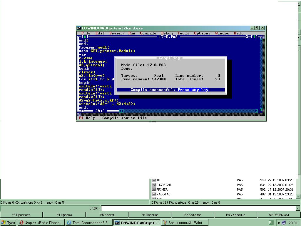 V.k.l.chr.by Мне очень неудобно обвинять Вас во лжи, но... i.k:integer; Вот тут компилятор обругает Вас нехорошими английскими словами. А ведь я Вас просил: Извините, более НЕ собираюсь Вам помогать. Полностью с Вами согласен насчёт ошибки.Но у меня не выдавала ошибку как ни странно.Вот высылаю скриншот.А ошибку исправил.После сего выдала ошибку"File not found"Кстати именно это и ошибка тоже выскакивала у меня в предудущих премарах когда тренировался на примерах.На именно стоит обратить внимание.По идее алгоритм решенее верен.Или... Эскизы прикрепленных изображений |