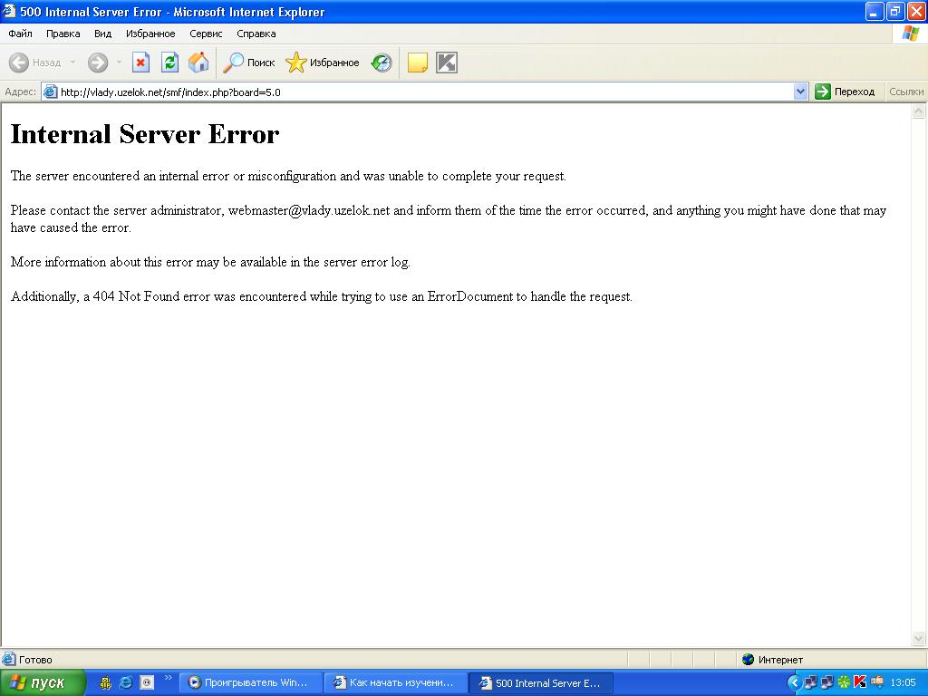 Цитата Internal Server Error The server encountered an internal error or misconfiguration and was unable to complete your request. Please contact the server administrator, webmaster@vlady.uzelok.net and inform them of the time the error occurred, and anything you might have done that may have caused the error. More information about this error may be available in the server error log. Additionally, a 404 Not Found error was encountered while trying to use an ErrorDocument to handle the request. Что я нетак делаю |