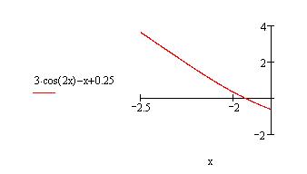 Всем Привет! Не могу понять как можно вычислить или доказать что у уравнения 3cos2x-x+0.25 существует единственный корень на отрезке [-2.5;-1.8]? Доказать нужно аналитическим методом. Построить рабочие формулы методом простых итераций результирующий процесс поиска корня линейного уравнения на указанном отрезке. знаю что на концах отрезка функция меняет знак а производная монотонно убывает на отрезке [-2.5-1.8]