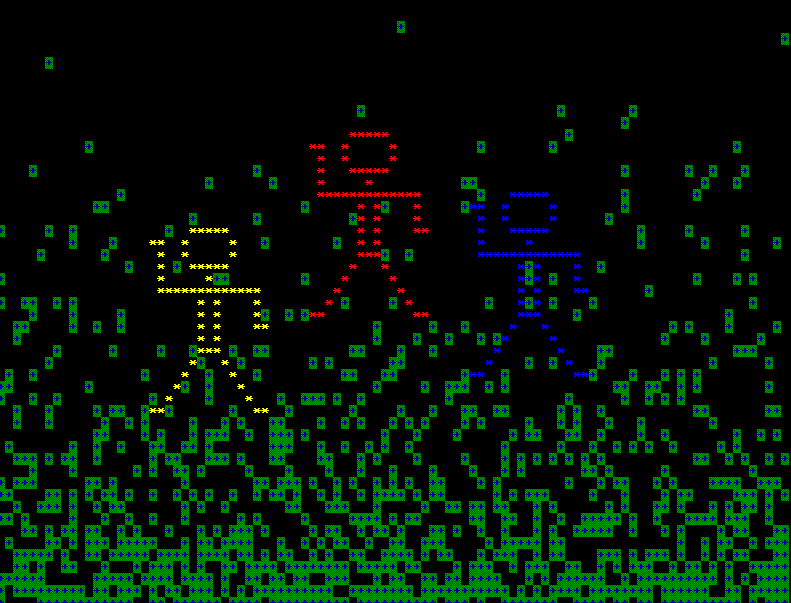 begin ClrScr; MaxX:=Lo(WindMax); MaxY:=Hi(WindMax); {заполняем фон} TextColor(Blue); TextBackGround(Green); for i:=1 to 2000 do begin GoToXY(Random(MaxX)+1,MaxY-Random(Random(Random(MaxY)))); Write('+') end; TextBackGround(Black); TextColor(Yellow); DrawMan(20,2); TextColor(LightBlue); DrawMan(60,6); TextColor(LightRed); DrawMan(40,8); GotoXY(1,Hi(WindMax)); ReadLn end.