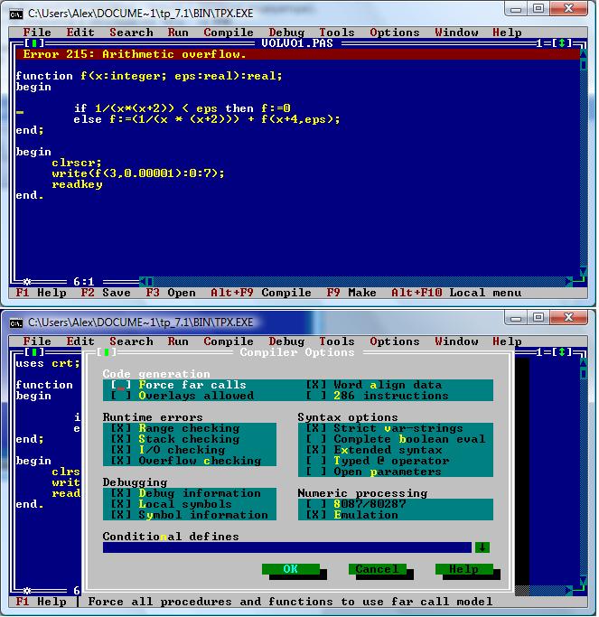 + к этому - пока никто не показал окончательный код, который не будет вылетать при eps = 1E-8независимо от настроек компилятора Турбо-Паскаля. То есть, независимо от того, выбран у меня режим эмуляции сопроцессора или режим 8087/80287... Окончательную версию в студию можно? А то выцеживаете по одной строке... Я что, одну строку привел?