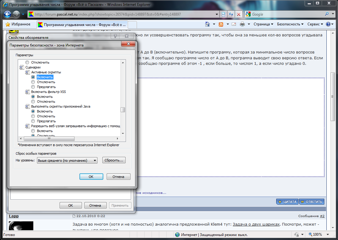 Такая проблема: после переустановки браузера на IE 8 не вижу подсветку содержимого в тэге [code=pas][/code] (подсвечивалось зеленым, синим), перестали работать кнопки "Спойлер" и "+" "-" (в повышении репутации). Может быть какие-то еще кнопки не работают, пока не заметил. Нажимаю - ничего не происходит. С чем это может быть связано? Что изменить?