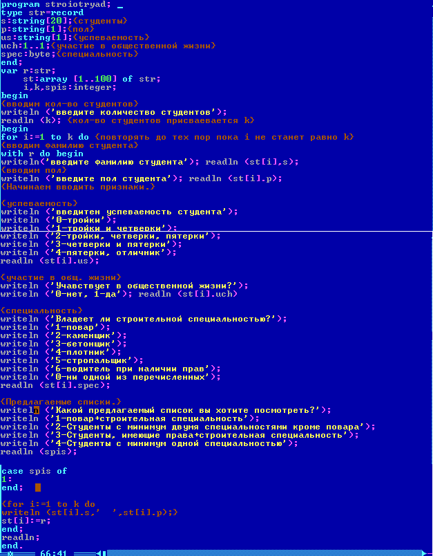Составить программу, помогающую отобрать студентов для участия в стройотряде. Вводятся: фамилия, пол, признаки: успеваемость, участие в общ жизни, овладение строительной специальностью, в случае овладения несколькими специальностями в качестве признака фигурирует число, каждая цифра которого - соотв. специальность. По требованию выдаются следующие сведения: список студентов - поваров+специальность строй. список студентов с минимум 2-мя спец кроме повара список студентов, имеющих права на вождение автомобиля+строй спец: плотник, каменщик, стропальщик. В стройотряд не берут студентов, успевающих на тройки. В каждом списке перечисляются сначала студенты, уч в общ. жизни, а затем не учавствующие. Код объемный. Сейчас скину скрины. Очень прошу помочь, я массивы плохо знаю, но хочу разобраться. Сообщение отредактировано: Diwixis - Эскизы прикрепленных изображений |