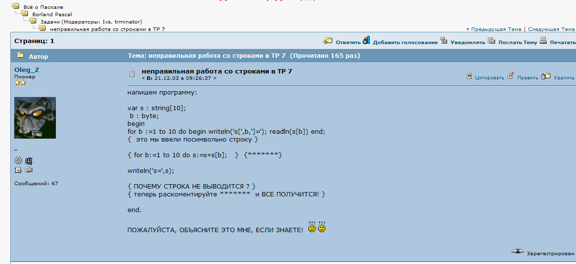 Цитата Строка изменяется, а длина остается прежней. Вспомним молодость.... мой первый пост на форуме, на этом.. любимом (еще бы...) форуме! неправильная работа со строками в TP7 ну разве мог я тогда подумать, зайдя на вот этот форум... что будет все, что сейчас есть у меня... ?!?! Не хватает только нашего AlaRic'a, ... ну простите меня, модераторы за сентиментальность -------------------- Помогая друг другу, мы справимся с любыми трудностями!