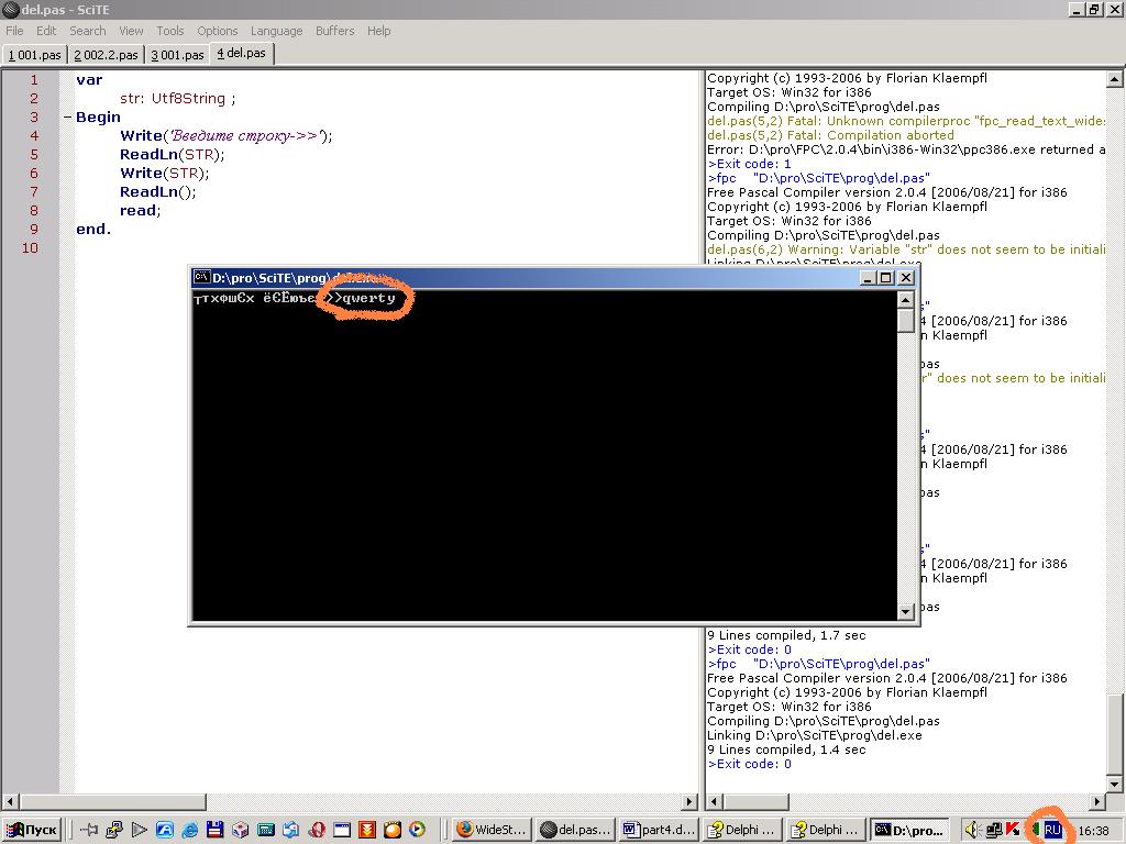 Допустим, простейшая задача, вывести строку с приглашением, прочитать русскую строку и вывести ее на экран.