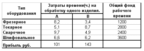 Затраты времени на обработку одного изделия для каждого их типов оборудования указаны в таблице. В ней же указан общий фонд рабочего времени каждого из