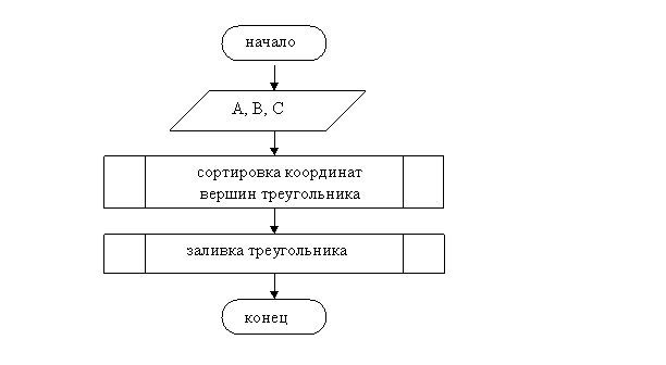 После проведения сортировки координат вершин данного треугольника необходимо организовать цикл, обеспечивающий рисование линий для ординаты Y, которая изменяется от Ymin до Ymax. В теле цикла необходимо определить координаты точек X1 и X2 и затем провести между ними линию заданного цвета.