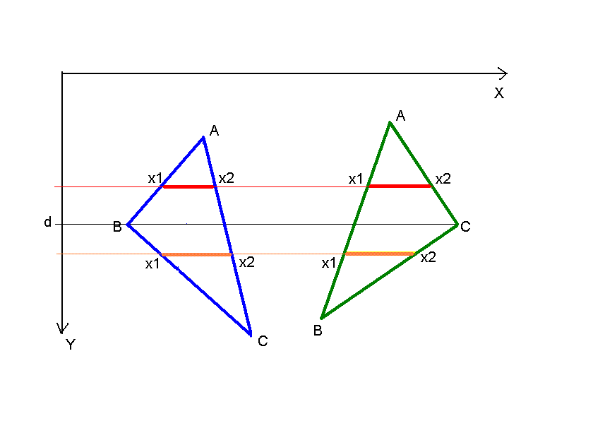 4. Проходим по Y от Ау до d, вычисляя х1 и х2 исходя из пересечения линии на уровне у, параллельной оси Х, и соответствующего отрезка.