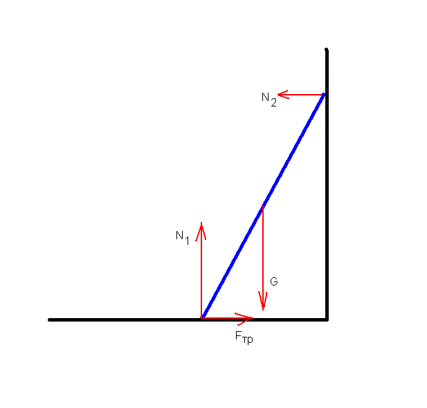 Но только равновесия сил тут мало. Гравитация и нормальная сила от пола, N1, вместе создают вращающий момент по часовой стрелке. А сила трения пола и нормальная сила от стенки, N2, (трение на стенке отсутствует, по-видимому, хотя автор темы не ответил мне на этот вопрос) создают момент против ч.с. Величина этих двух сил как раз обуславливается равенством моментов, причем N2=-Fтр (в покое). Но сила трения имеет предел, равный G*k, или, в данных условиях, 0.5*G. При наклоне лестницы (начиная от стоячего положения у стенки) момент первых двух сил возрастает, так как возрастает плечо, равное 0.5*L*cos(a), а угол а=90 и уменьшается. Плечо же вторых двух сил уменьшается, так как оно равно L*sin(a). Легко видеть, что равенство моментов (учитывая, что k=0.5) наступает при а=45.