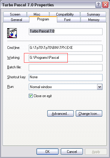Цитата как сделать, так, что бы Паскаль открывал (шоб оькрыть файл) одну и ту же папку Открывать Паскаль через Ярлык, и прописать в этом Ярлыке нужную рабочую директорию:Эскизы прикрепленных изображений |