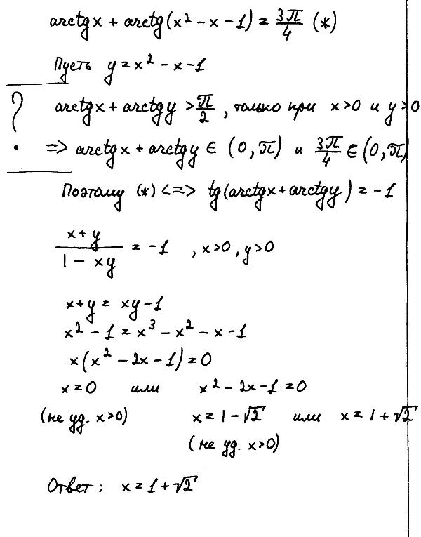 В этом задании я не написал сам две строчки (они помечены на рисунке), так вот, почему они тут так необходимы, и почему из первой строчки следует именно вторая, а не вот такой вариант: сумма арктангенсов принадлежит промежутку от Пи попалам до Пи и угол 3Пи/4 тому же промежутку соответственно???
