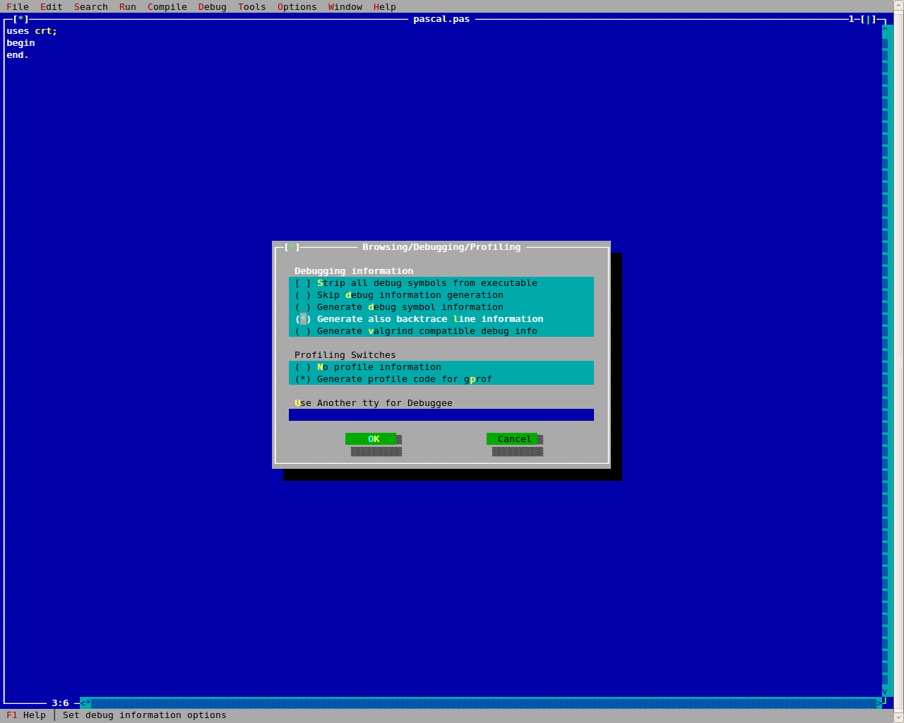 Много каких вариантов установки FPC нашел в сети, заинсталил следующим образом: # apt-get install fp-compiler # apt-get install fpc-ide Но при попытке прогнать программу пошагово, выдает вот такое: Собственно как добыть debugger -------------------- perl -e 'print for (map{chr(hex)}("4861707079204E6577205965617221"=~/(.{2})/g)), "\n";'