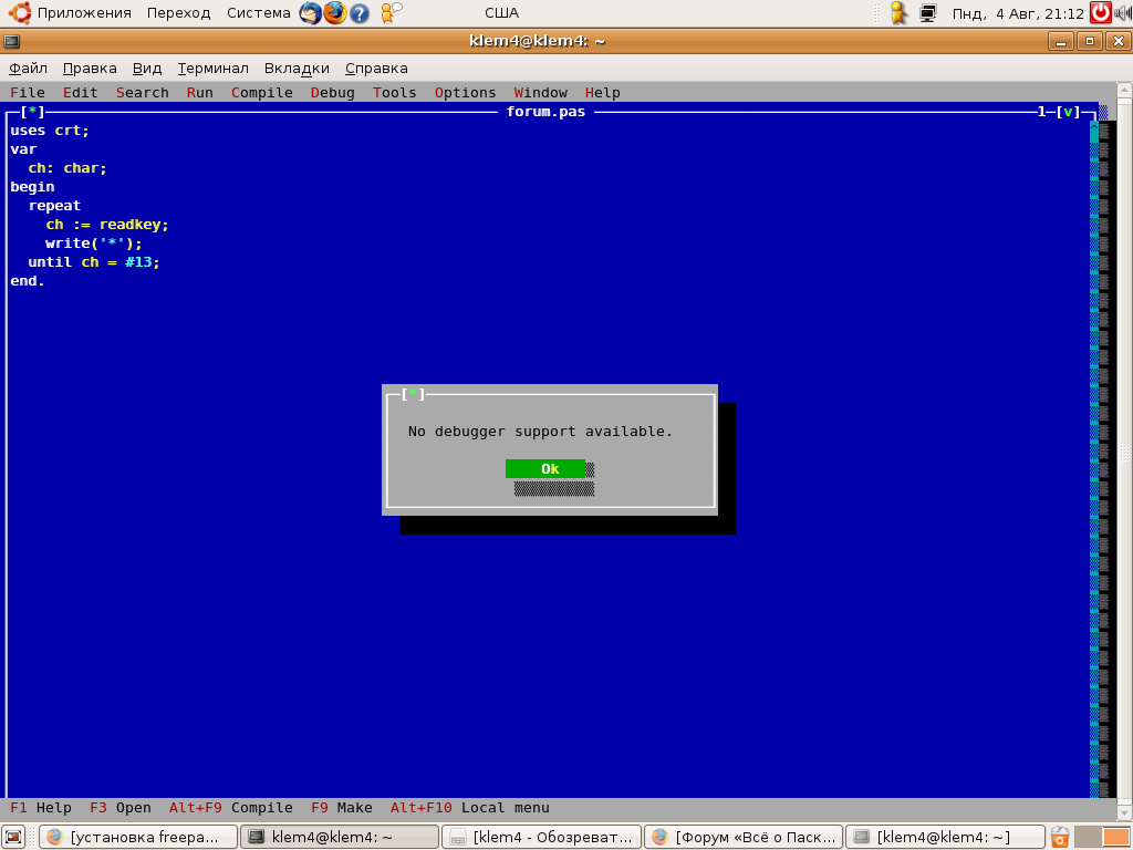 Много каких вариантов установки FPC нашел в сети, заинсталил следующим образом: # apt-get install fp-compiler # apt-get install fpc-ide Но при попытке прогнать программу пошагово, выдает вот такое: Собственно как добыть debugger -------------------- perl -e 'print for (map{chr(hex)}("4861707079204E6577205965617221"=~/(.{2})/g)), "\n";'