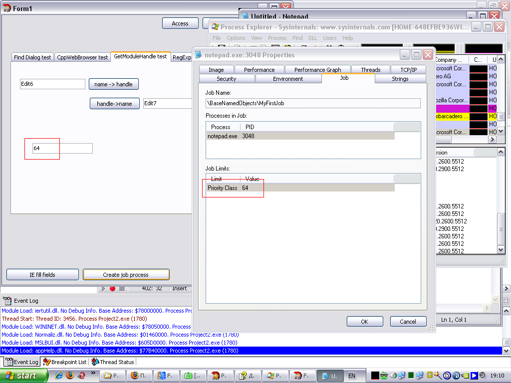 Что показывает ProcessExplorer? Установились твои приоритеты для JobObject?