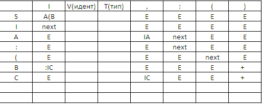 Я тут приблизительно составил таблицу с учетом типа и идентификатора. Но мне непонятен принцип построения грамматики, откуда берутся символы: S, A, B, C, и почему тому или иному символу соответствует - ( или IA(B например, почему А,В,С используются по 2 раза, а S-один. Поэтому завершить таблицу несмог...