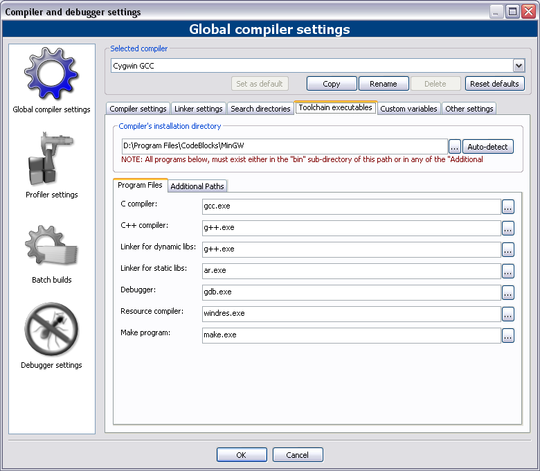 Не понял... Ты какой файл качал по ссылке, что я дал? Который "codeblocks-8.02-setup.exe" или "codeblocks-8.02mingw-setup.exe"? Если первый, то тебе надо установить компилятор самостоятельно, он не идет в комплекте. А если второй - то должно быть все в порядке при Cygwin GCC... Показывай окно настройки компилятора, и смотри, 1) есть ли такая папка, которая в нем указана 2) есть ли все те EXE-файлы, которые указаны ниже: