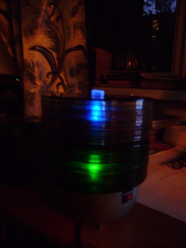 Немного преобразовал идею: поставил 2 дорогих светодиода-хамелеона, один резистор на 330 Ом, и подставку от какогото старого ночника. Несколько часов усилий и пайки, и вышло нечто интересное, ночью смотриться весьма красиво... правда яркость светодиодов подкачала. Питаеться это всё от юсб.