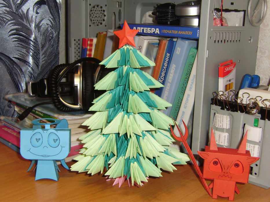 Правда при сборке значительно отошёл от первоначальной конструкции, отказался от розделительных секций между ярусами, коечто модернизировал, и придумал другую верхушку, в результате все ярусы вращаються свободно относительно друг друга, и с боку ёлка смотриться не хуже чем сверху, что нескажешь о той что описана в статье. З.Ы. Чёртик и ангелочек - неотемлемые атрибуты этой же ёлки В ближайших планах подсветить всё это дело самопальной светодиодной подсветкой, от юсб.... Сообщение отредактировано: RathaR - -------------------- Считающий себя единственым здравомыслящим человеком сумасшедший? Если да, возможно я псих...