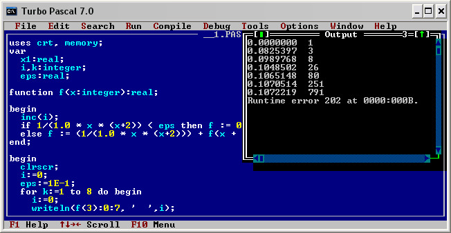 пока никто не показал окончательный код, который не будет вылетать при eps = 1E-8 независимо от настроек компилятора Турбо-Паскаля. То есть, независимо от того, выбран у меня режим эмуляции сопроцессора или режим 8087/80287...
