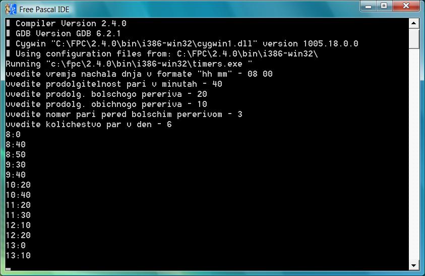 В учебном заведении известно начало рабочего дня, продолжительность пары или урока в минутах, продолжительность обычного и большого перерывов и их место в расписании, а также количество пар (уроков) в день. Напишите программу, которая составляет расписание звонков на весь учебный день.