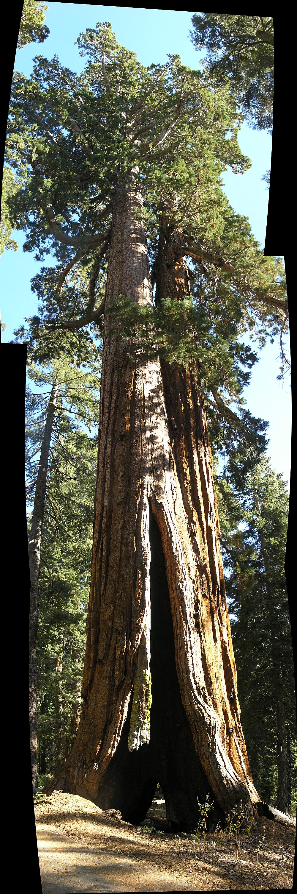 Такого примера у меня нет (. Но все же мне иногда приходило в голову, что панорама не обязана быть горизонтальной. Например, я снимал деревья, которые не влезали в кадр по высоте. Первая картинка склеена из двух кадров. Ее я обрезал по краям и склейка не видна абсолютно )).