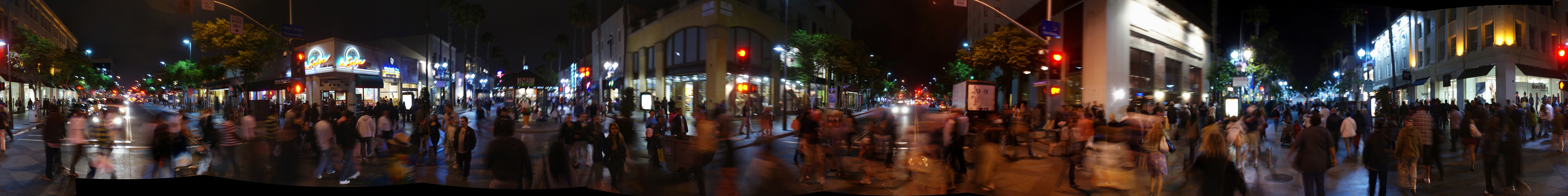 о. Снято на перекрестке бульвара Санта-Моника и 3-й улицы (последняя - не проезжая, а пешеходная, типа нашего Арбата). Я выходил точно в центр перекрестка, когда загорался зеленый, и снимал в стороны. Идея сделать это мне пришла спонтанно, и было 10 вечера, то есть темно. Я не надеялся, что получится что-то путное.. но результат меня порадовал, хотя все было нерезко, смазано, фон не проработан и вообще.. Но вечерний колорит все же был неплох. И я решил приехать туда еще и поснимать в сумерки, когда огни реклам уже ясно видны, но есть и естественная подсветка. Ну, приехал, снял, посмотрел.. Да, проработано, да, резче.. И что с того?