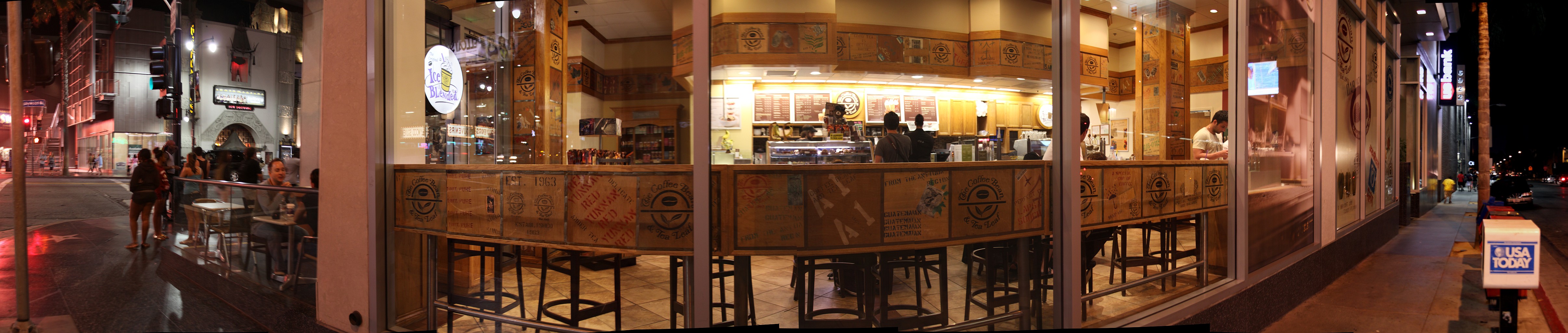 Сегодня я, вообще-то, поехал было в горы. Но, как оказалось, все дороги закрыты по причине пожаров и пожарной опасности ((. Домой проехал через Голливуд, поснимал там. Нашел довольно много интересных моментов, но все пока сыро - не для показа. Единственное, что вышло хоть как-то прилично - кафушка Coffee Bean (где я иногда бываю и пишу сюда)). Обзор 180. Улица получилась гнутой, будто это угол (на самом деле стена прямая)). То есть, это действительно угол бульвара Голливуд и Orange (на которой я раньше жил) - но он немного левее, а снимаю я с Orange, которую и скрючило углом