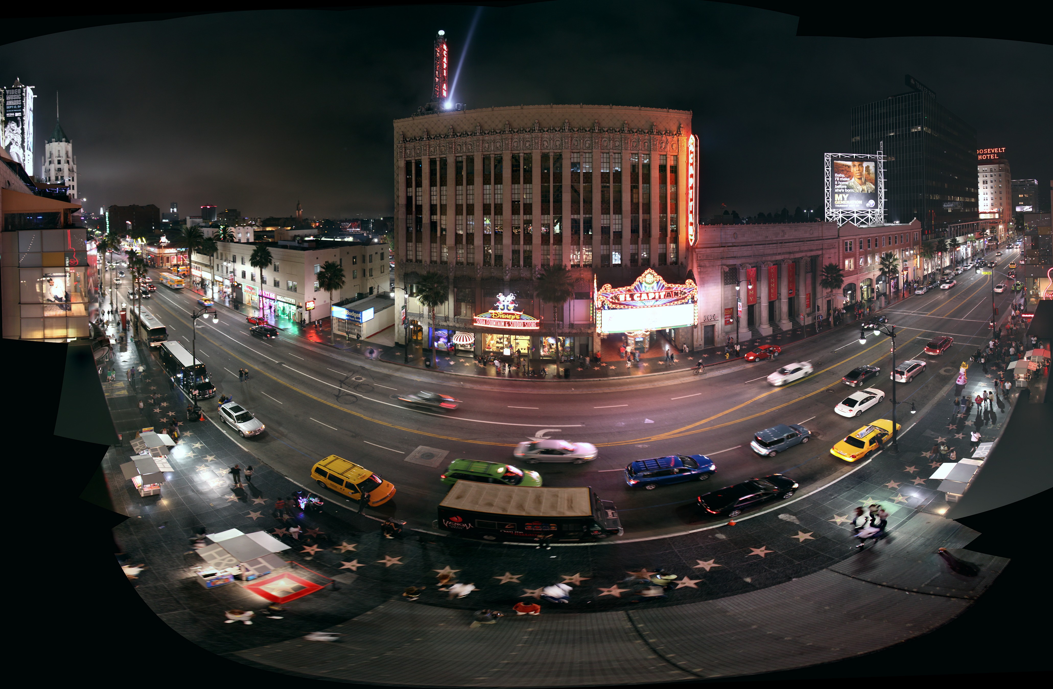 Вот еще одна панорамка - вид на бульвар Голливуд с балкона. Я очень старался не совсем зарезать разрешение, оставил 2700 по вертикали при качестве жипега 90. Рекомендую рассмотреть по кускам в 100% приближении. Аллея звезд хорошо просматривается с двух сторон. Имена на них все же не прочесть, даже на оригинале )). Разрешения хватило бы, но я снимал с рук, и даже стабилизация не помогла.