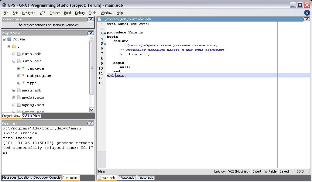 Скачал я себе ГНАТ (Gnat GPL(без исходников, поленился все ссылки тыкать) и Win32Ada. Скопировал я для начала в редактор кода текст из Википедии: