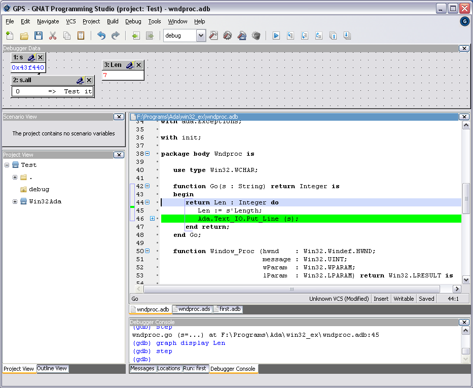 Скачал я себе ГНАТ (Gnat GPL(без исходников, поленился все ссылки тыкать) и Win32Ada.
