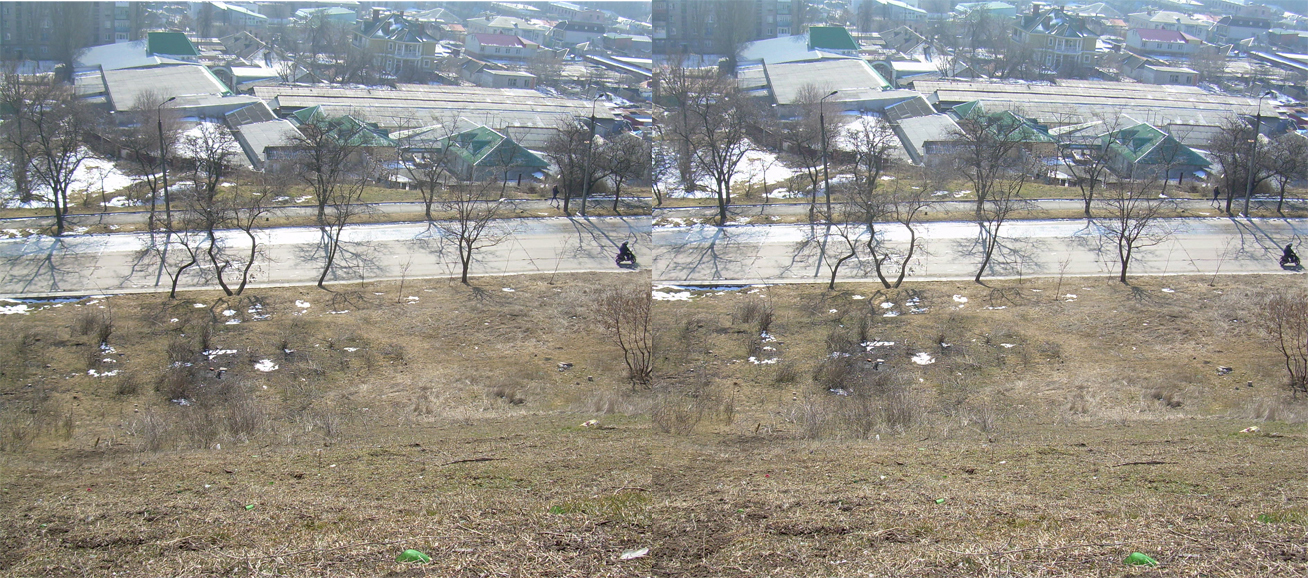 Несколько слов о том, как я делаю эти пары. Я выбираю подходящий сюжет, после чего встаю к нему лицом на две ноги, расставленные на ширину плеч. Затем переношу тяжесть тела на левую ногу и делаю снимок. После этого передвигаю тело так, чтобы тяжесть падала на правую ногу и делаю еще один снимок. При этом нужно следить, чтобы границы кадров приблизительно совпадали (особенно по заднему плану). Следует избегать сдвижения камеры по вертикали, а также ее поворотов вокруг оси съемки (хотя повороты можно убрать в фотошопе). Далее, если у вас автоэкспозиция - следите, чтоб она была одинаковой при съемке этих двух кадров (либо переключитесь на ручник). Фокус тоже желательно наводить по одному предмету, а не по разным (либо тоже использовать ручной). База (расстояние, на которое вы смещаетесь) играет роль, но не критична. В целом так: желательно, чтоб она была чуть больше, чем реальное расстояние между глазами (для усиления эффекта) - раза в два еще нормально. Если вы снимаете с зумом, то нужно увеличивать базу пропорционально ему. Ну и конечно, так нельзя снимать движущиеся предметы - для этого нужно использовать две синхронизированные камеры. Даже облака могут сыграть злую шутку.. smile.gif Вообще, это совсем не трудно. Глаза и мозг настолько хорошо делают свою работу, что способны иправить ваши общибки, допущенные при съемке smile.gif.