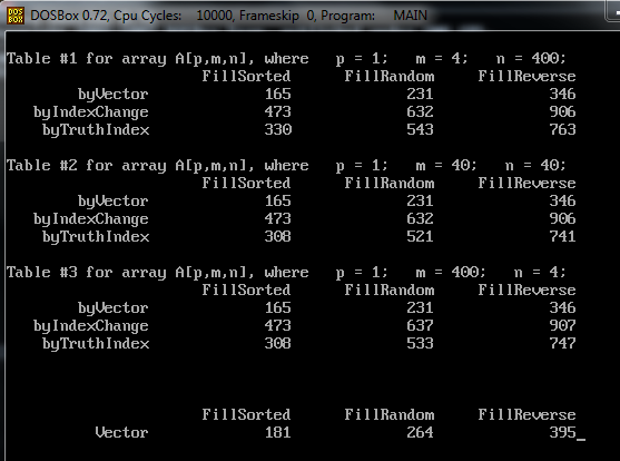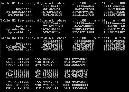 Меня интересует вот какой вопрос: почему там, где массив отсортирован, где этих обменов вообще нет, а только проверка условия, значения 40*40 и 400*4 совпадают, и очень отличаются от 4*400 ??? И почему вот здесь вектор(1600элементов) сортируется медленнее такой аналогичной сортировки матрицы, где сначала вектор заполняется из матрицы, а потом возвращается.