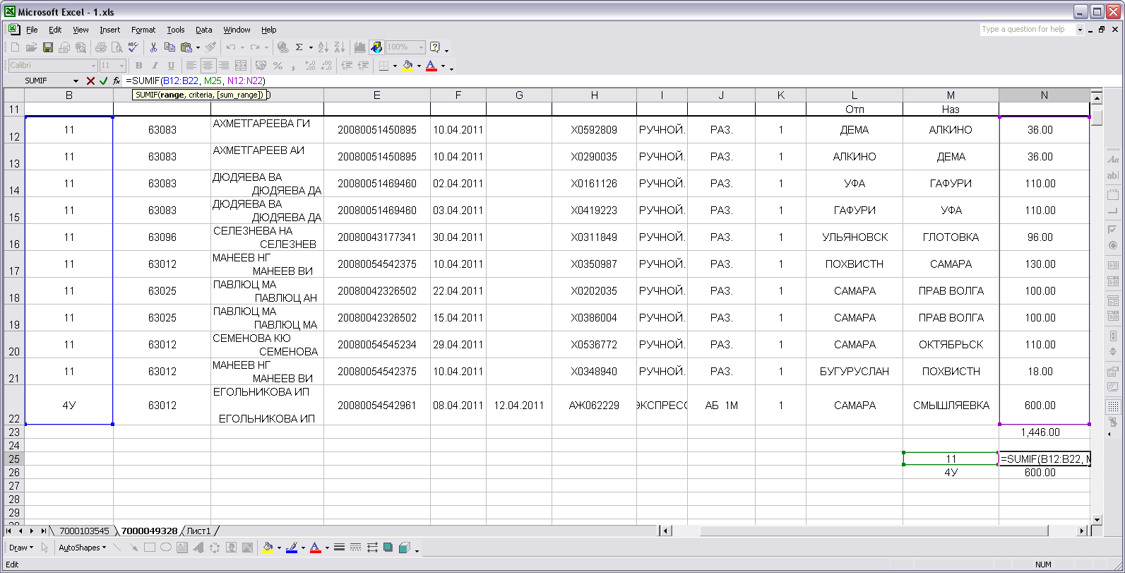 Понимаешь идею? То есть, тебе достаточно на лист забросить несколько (по числу разных форм) ячеек с формулами. Формулы - почти одинаковые, разница - только в среднем поле, для N26 из моего примера, это =SUMIF(B12:B22, M26, N12:N22). А рядом, слева (ну, это уже по желанию, можно и справа smile.gif ) собственно, для какой формы это все считается. Формула одна, результаты - разные.