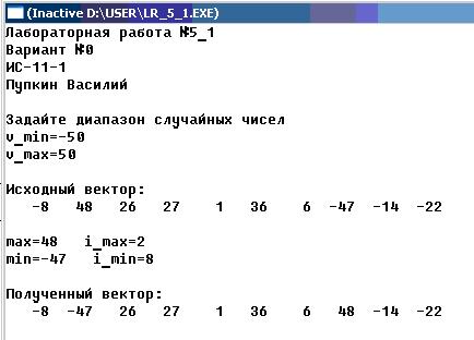 Входные данные: n=10 v_min=-5 v_max=10 Исходный вектор: 7 -5 1 3 -2 5 2 0 10 1 Выходные данные: min=-5 n_min=2 max=10 n_max=9 Выходной вектор: 7 -5 0 2 5 -2 3 1 10 1 |