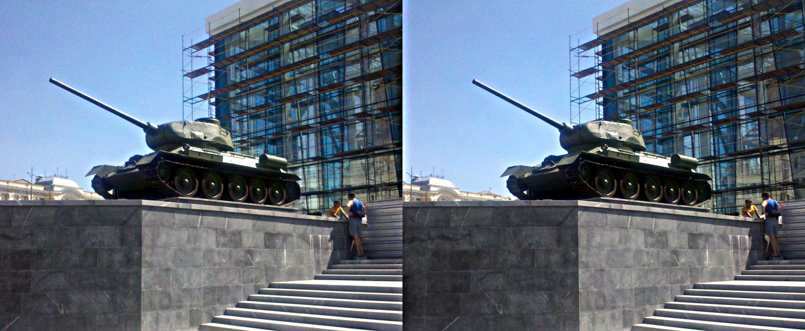 Несколько слов о том, как я делаю эти пары. Я выбираю подходящий сюжет, после чего встаю к нему лицом на две ноги, расставленные на ширину плеч. Затем переношу тяжесть тела на левую ногу и делаю снимок. После этого передвигаю тело так, чтобы тяжесть падала на правую ногу и делаю еще один снимок. При этом нужно следить, чтобы границы кадров приблизительно совпадали (особенно по заднему плану). Следует избегать сдвижения камеры по вертикали, а также ее поворотов вокруг оси съемки (хотя повороты можно убрать в фотошопе). Далее, если у вас автоэкспозиция - следите, чтоб она была одинаковой при съемке этих двух кадров (либо переключитесь на ручник). Фокус тоже желательно наводить по одному предмету, а не по разным (либо тоже использовать ручной). База (расстояние, на которое вы смещаетесь) играет роль, но не критична. В целом так: желательно, чтоб она была чуть больше, чем реальное расстояние между глазами (для усиления эффекта) - раза в два еще нормально. Если вы снимаете с зумом, то нужно увеличивать базу пропорционально ему. Ну и конечно, так нельзя снимать движущиеся предметы - для этого нужно использовать две синхронизированные камеры. Даже облака могут сыграть злую шутку.. smile.gif Вообще, это совсем не трудно. Глаза и мозг настолько хорошо делают свою работу, что способны иправить ваши общибки, допущенные при съемке smile.gif.