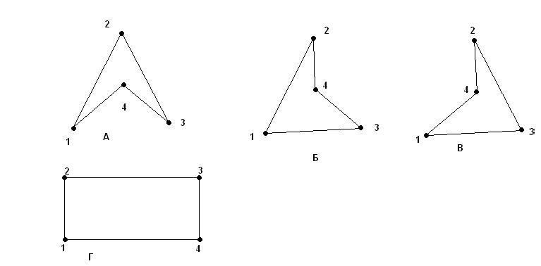 для случая «Б» верна диагональ только 1– 4 (а, не 2 – 3), для случая «В» верна диагональ только 3– 4 (а, не 1 – 2). Как можно распознавать такие четырехугольники (случаи «А», «Б», «В») Сообщение отредактировано: Andy - Эскизы прикрепленных изображений |