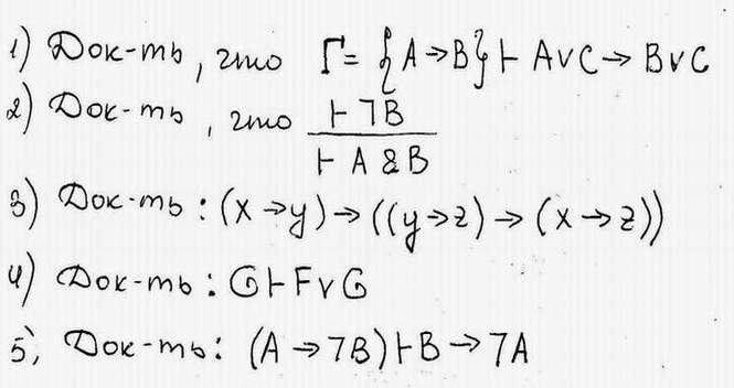 (|- знак выводимости .... --> импликация ....... V дизъюнкция .... & конъюнкция) Особенно интересует 1,2 и 5 примеры .... Можь у кого электронные лекции есть, с примерами решения??? Буду благодарен!!! :thanks: