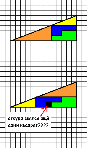 Ходил я, значит, с классом в какой-то там музей при институте "разных интересных вещей", многое меня удивило, многое я не знал, но одну из интересных вещей я решил сдесь выложить. ИНТЕРЕСНЫЙ РИСУНОК(сам перерисовывал)!!! Треугольники одинаковы, фигуры в них тоже. Откуда взялася ещё одна фигура??! Иллюзия или...?!