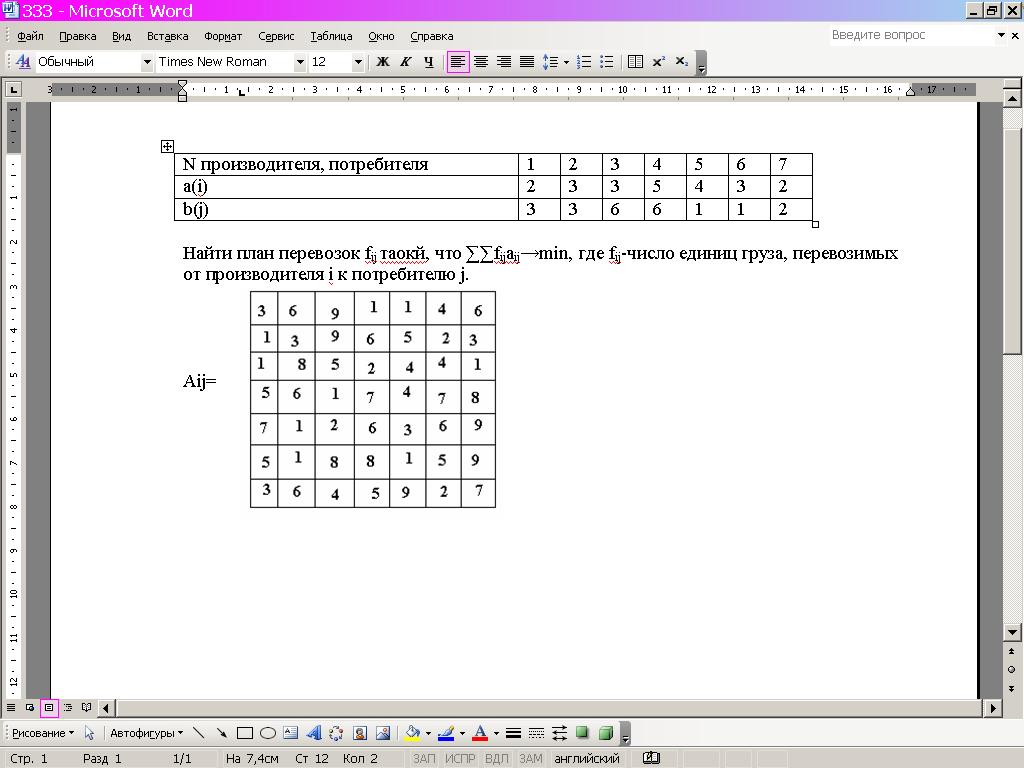 3. Задана матрица (aij)-стоимости доставки единицы груза от производителя i к потребителю j. Предложение a(i) производителя и спрос b(j)-потребителя единицы груза задаются в виде таблицы: